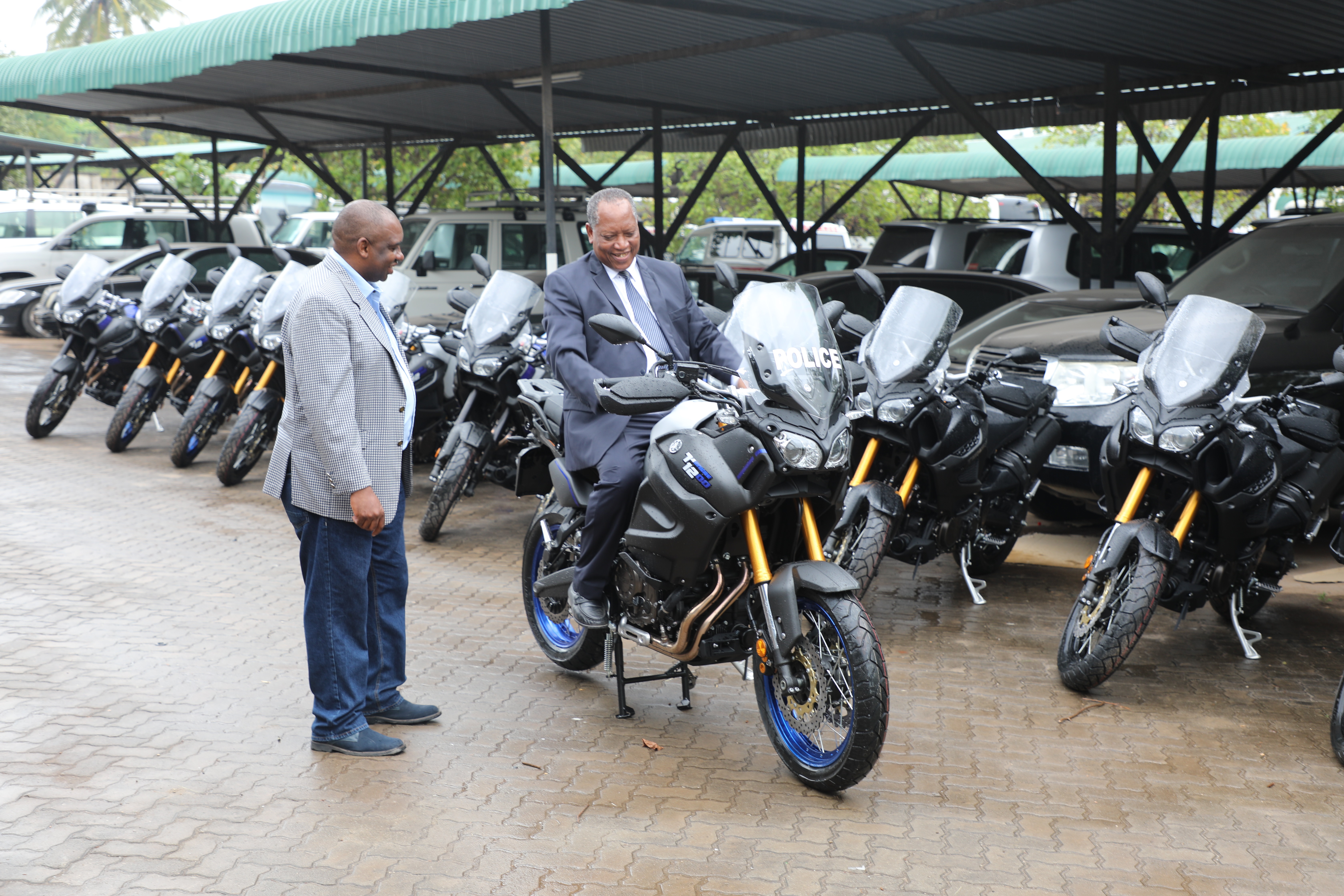 Waziri wa Mambo ya Nje na Ushirikiano wa Afrika Mashariki Prof. Palamagamba John Kabudi akiwa anafurahia mojawapo ya pikipiki mpya zinazoandaliwa kwa ajili ya mapokezi na kuongoza misafara ya viongozi,Wakuu wa Nchi na Serikali watakaohudhuria mkutano wa Jumuiya ya Maendeleo Kusini mwa Afrika (SADC) unaoendelea Jijini Dar es Salaam,Tanzania. Anayeshuhudia ni Afisa Usafirishaji – IKULU Bw. Zuberi Kachingwa.