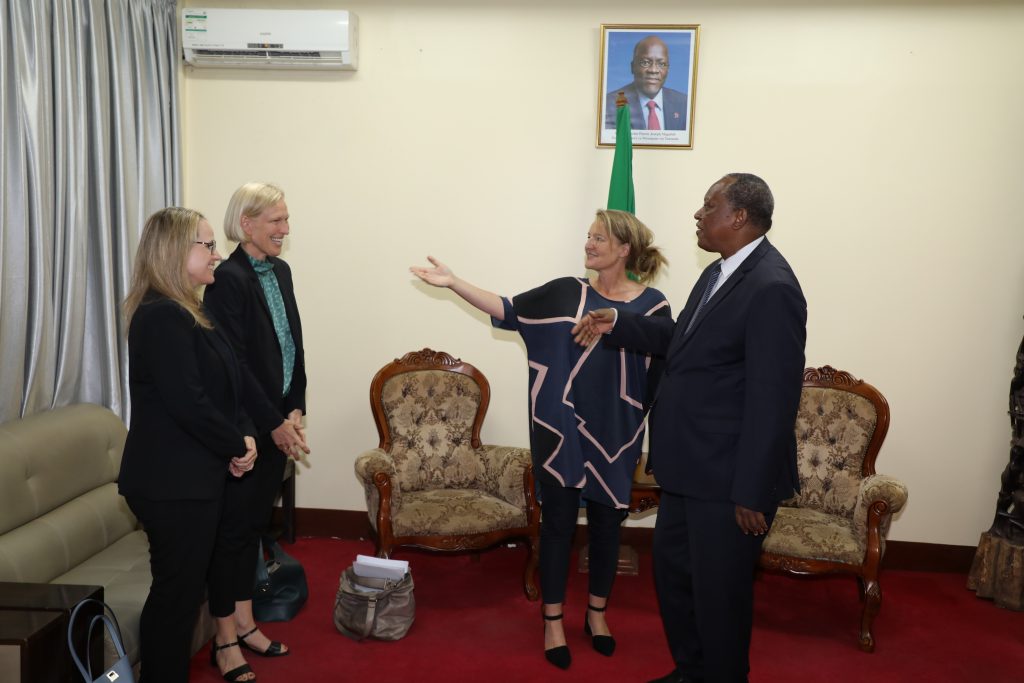 Balozi Mteule wa Denmark hapa Nchini,Mhe. Mette Norgaard Dissing-Spandet akiwatambulisha kwa Waziri wa Mambo ya Nje na Ushirikiano wa Afrika Mashariki Prof. Palamagamba John Kabudi baadhi ya maafisa aliongozana nao,wakati alipofika katika ofisi ndogo za Wizara ya Mambo ya Nje na Ushirikiano wa Afrika Mashariki Jijini Dar es Salaam kwa ajili ya kukabidhi nakala za hati za utambulisho.