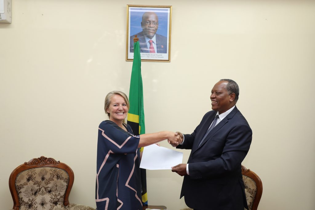 Balozi Mteule wa Denmark hapa Nchini,Mhe. Mette Norgaard Dissing-Spandet akimkabidhi Waziri wa Mambo ya Nje na Ushirikiano wa Afrika Mashariki Prof. Palamagamba John Kabudi nakala za hati za utambulisho. Tukio hilo limefanyika katika ofisi ndogo za Wizara ya Mambo ya Nje na Ushirikiano wa Afrika Mashariki Jijini Dar es Salaam