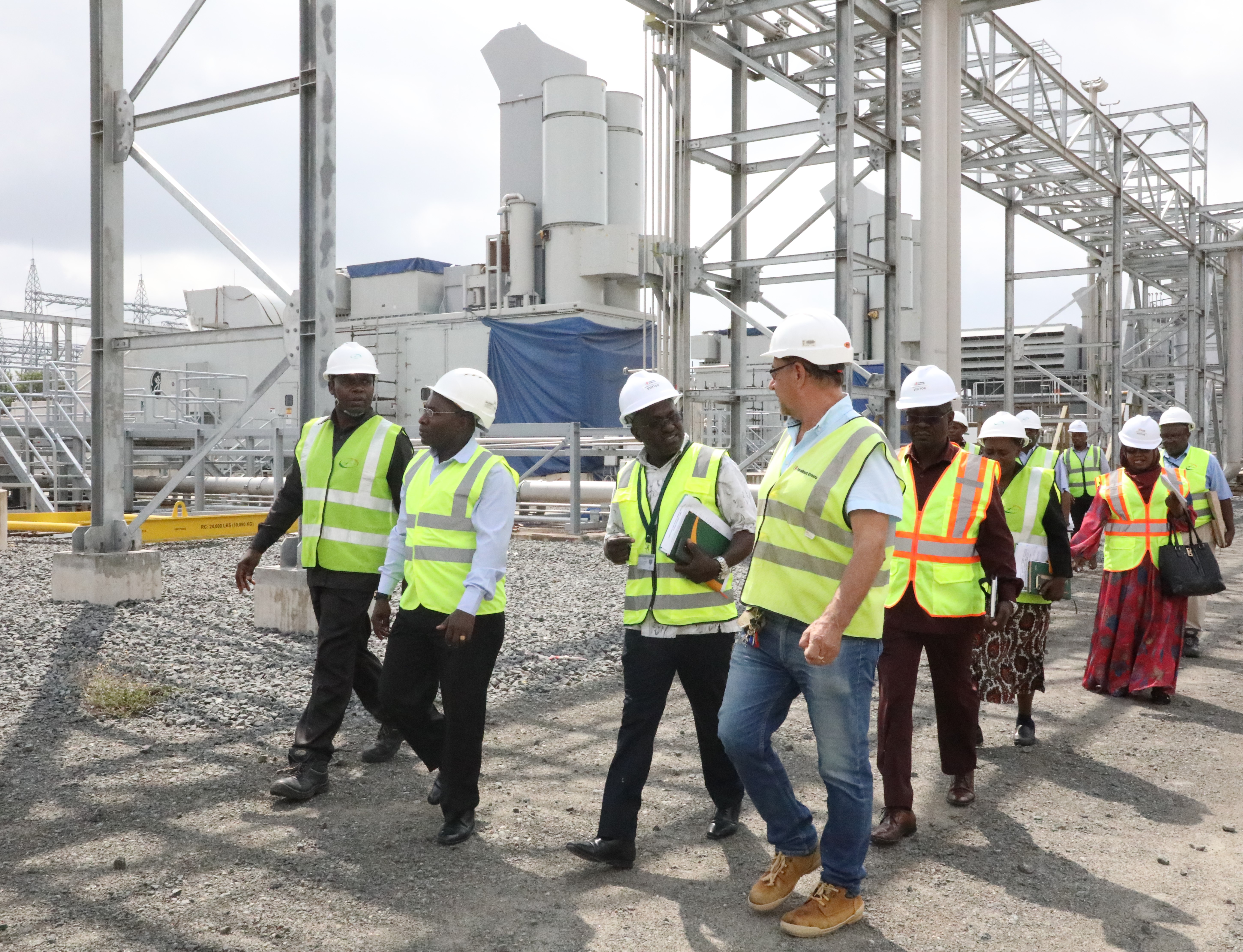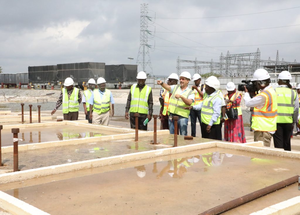 Mtaalam kutoka kampuni ya Jacobsen Electric akitoa maelezo kwa Waziri wa Nishati Dkt, Medard Kalemani kuhusu utekelezaji wa mradi wa Kinyerezi 1 Extension.