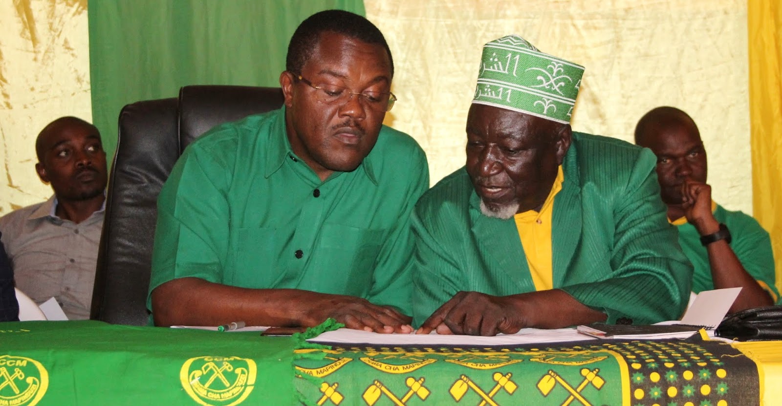 Mjumbe wa halmashauri kuu taifa (NEC) Gaspar Kileo akiteta jambo na mwenyekiti wa umoja wa wazazi CCM Mkoa wa Shinyanga Salum Abdala Simba,kwenye kongamano la kupongeza utendaji kazi wa Rais John Magufuli kwa kutekeleza ilani ya CCM kwa asilimia 100.
