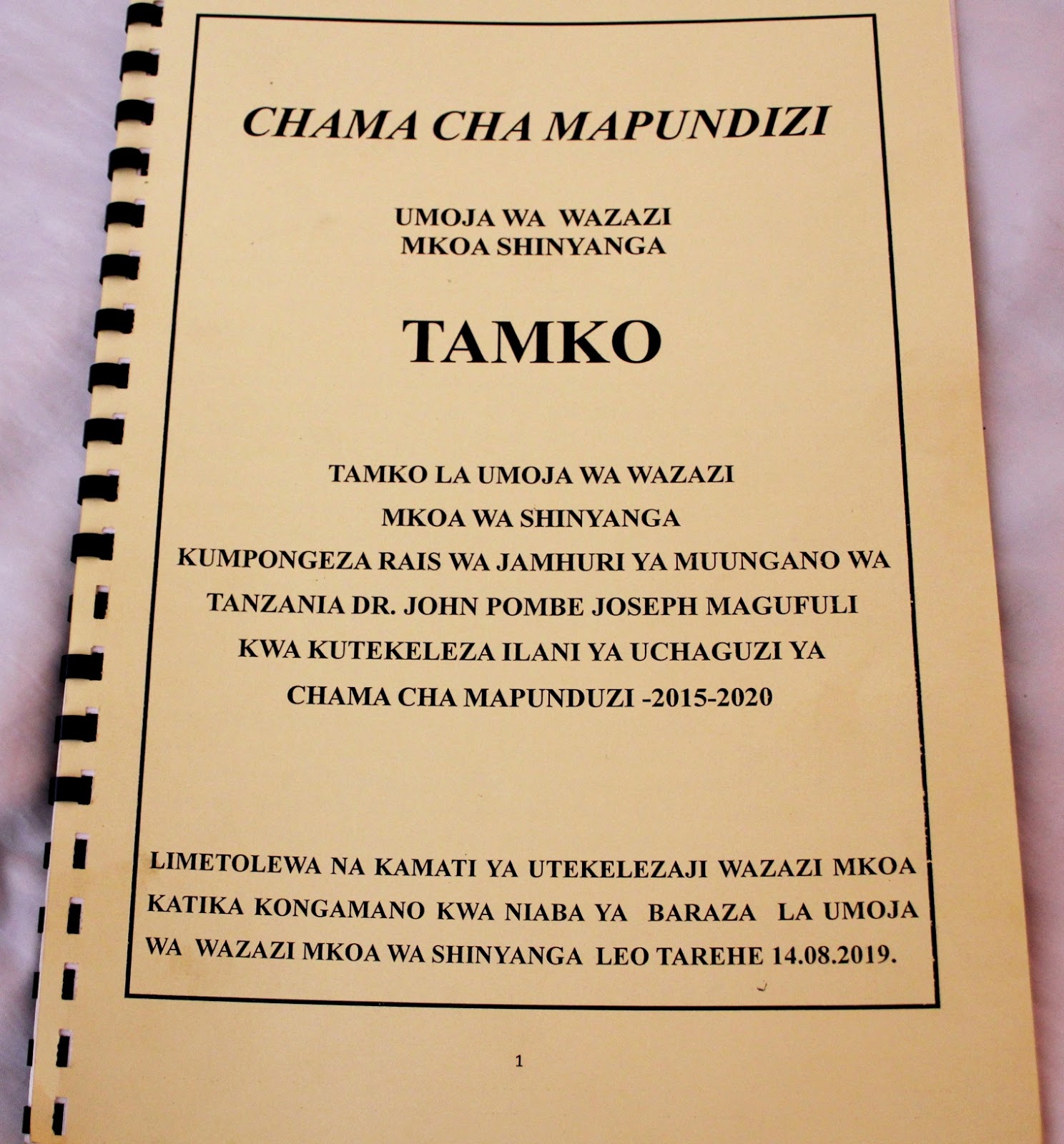 Kitabu chenye tamko la Umoja wa Wazazi CCM Mkoa wa Shinyanga la kumpongeza Rais John Magufuli kwa kutekeleza ipasavyo ilani ya uchaguzi ya Chama Cha Mapinduzi (CCM).