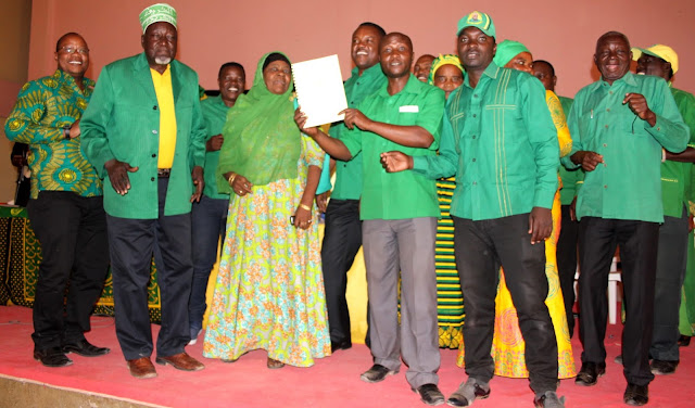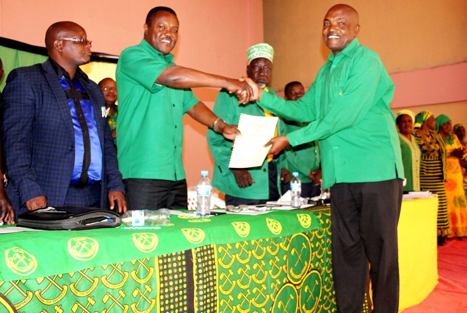Katibu wa Umoja wa wazazi CCM Mkoa wa Shinyanga Masanja Salu, mkono wa kulia akimkabidhi tamko la kumpongeza Rais John Magufuli, mjumbe wa halmashauri kuu ya CCM Taifa NEC mkoani Shinyanga Gaspar Kileo kwa niaba ya Rais ambapo atamfikishia tamko lao.