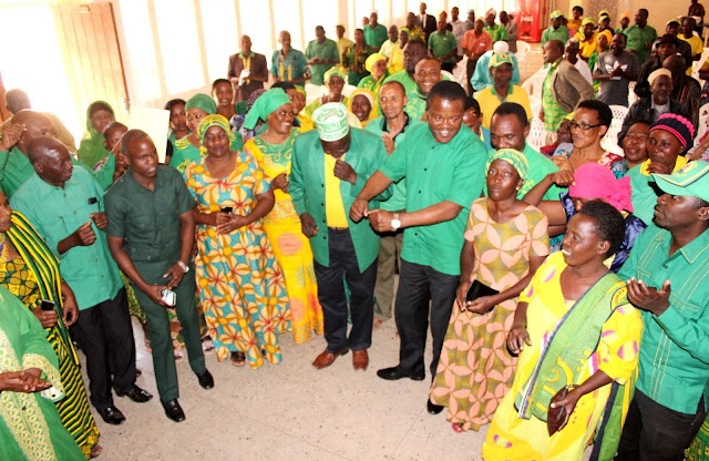 Mjumbe wa halmashauri kuu Taifa (NEC) Gaspar Kileo akiwasili kwenye ukumbi wa CCM Mkoa wa Shinyanga kwa ajili ya kupokea Tamko la kumpongeza Rais John Magufuli lililoandaliwa na umoja wa wazazi CCM Mkoani humo, ambapo amepokelewa na viongozi wa umoja huo, huku akiwa ameshikana mkono na katibu wa umoja wa wazazi mkoa wa Shinyanga Masanja Salu.