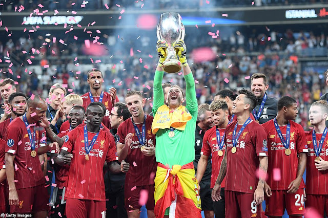 Kipa Mspaniola, Adrian San Miguel del Castillo akiwa ameshika taji la Super Cup la UEFA katika picha ya pamoja na wachezaji wenzake wa Liverpool baada ya kuiwezesha timu yao kuifunga Chelsea kwa penalti 5-4 kufuatia sare ya 2-2 ndani ya dakika 120 usiku wa jana Uwanja Vodafone Arena mjini İstanbul, Uturuki. Mabao ya Chelsea yalifungwa na Olivier Giroud dakika ya 36 na Jorginho dakika ya 101 kwa penalti, wakati ya Livepool yote yalifungwa na Sadio Mane dakika ya 48 na 95 kabla ya Adrian kupangua mkwaju wa penalti wa Tammy Abraham.