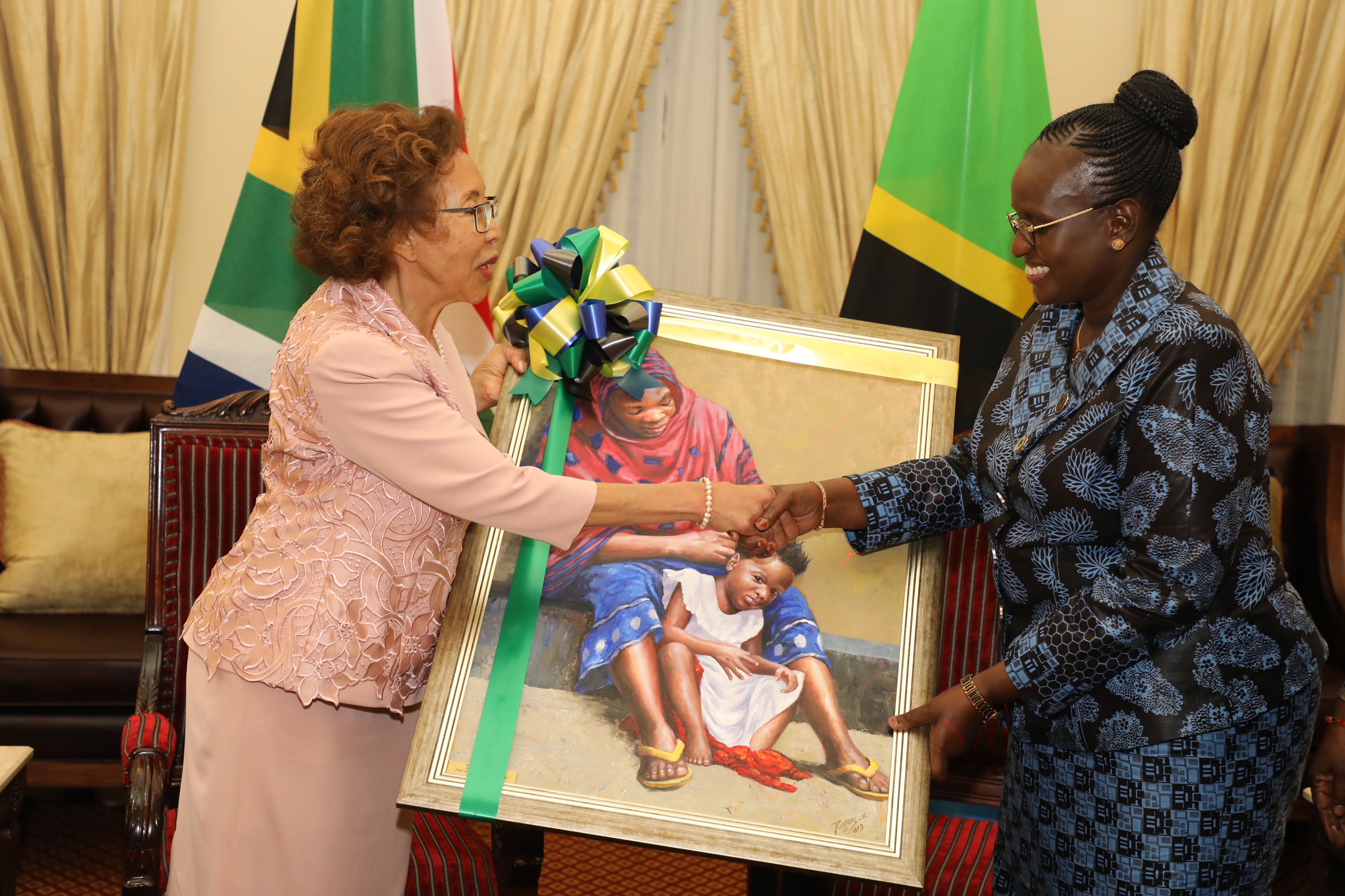 Mke wa Rais Mama Janeth Magufuli akimkabidhi zawadi ya Picha mke wa Rais wa Afrika Kusini Dkt. Tshepo Motsepe-Ramaphosa mara baada ya kuwasili Ikulu jijini Dar es Salaam.