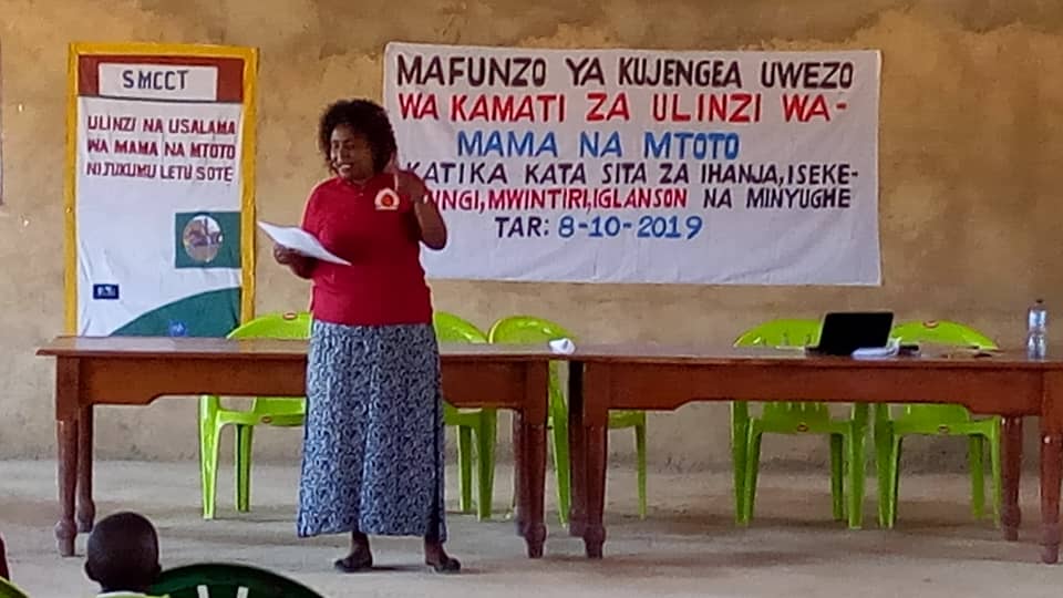 Mkurugenzi Mtendaji wa Shirika la SMCCT, Evalyen Lyimo, akitoa mafunzo kuhusu lishe na chakula kwenye mkutano wa kutokomeza vitendo vya ukatili dhidi ya mtoto na mama katika Kata sita zilizopo Wilaya ya Ikungi mkoani Singida. Mafunzo hayo yalikuwa na lengo ya kuzijengea uwezo kamati za ulinzi wa mama na mtoto ngazi ya wilaya hiyo.