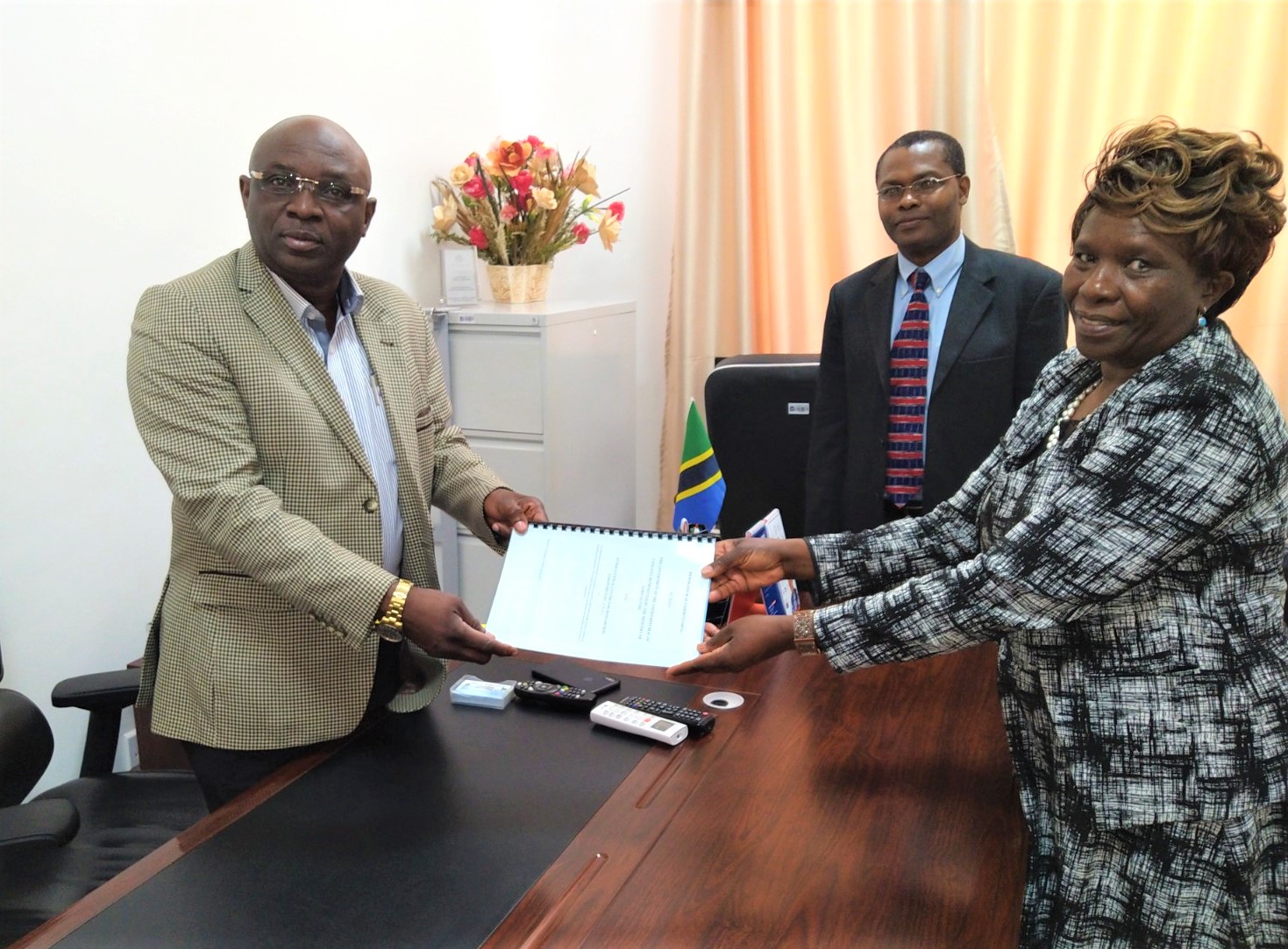 Katibu Mkuu, Wizara ya Kilimo, Mhandisi Mathew Mtigumwe kushoto kwa niaba ya Wizara akimkabidhi hati ya makubaliano ya kushirikiana na Taasisi ya Kimataifa ya ICRAF mara baada ya kusaini ya makubalianao ya kushirikiana kulia ni Msimamizi Mkuu wa Taasisi hiyo Bi. Catherine Muthuri, katika Ofisi za Wizara ya Kilimo katika eneo la Mtumba, Jijiji Dodoma leo tarehe 16/08/2019.