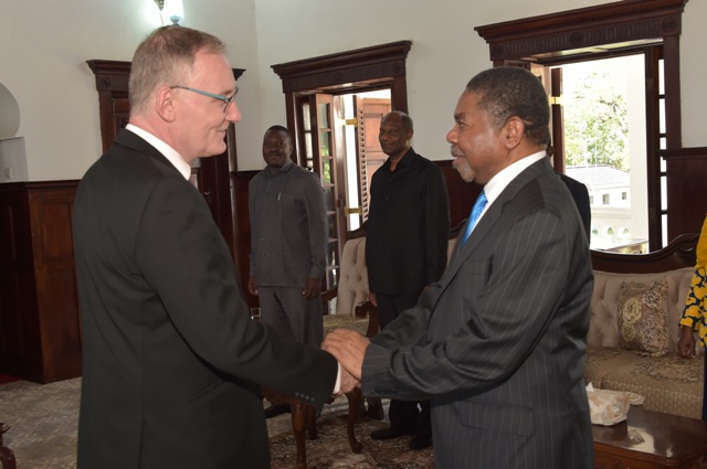Rais wa Zanzibar na Mwenyekiti wa Baraza la Mapinduzi Dk.Ali Mohamed Shein (kulia) akisalimiana na Mratibu Mkaazi wa Umoja wa Mataifa Nchini Tanzania Bw.Alvaro Rodrigues alipofika Ikulu Mjini Zanzibar leo kwa ajili ya kumuaga Rais baada ya kumaliza muda wake wa kazi nchini.[POicha na Ikulu.] 20/08/2019.