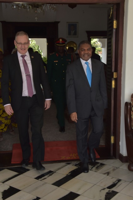 Rais wa Zanzibar na Mwenyekiti wa Baraza la Mapinduzi Dk.Ali Mohamed Shein (kulia) akifuatana na mgeni wake Mratibu Mkaazi wa Umoja wa Mataifa Nchini Tanzania Bw.Alvaro Rodrigues baada ya kumaliza mazungumzo yao yaliyofanyika leo alipofika Ikulu Mjini Zanzibar kwa ajili ya kumuaga Rais baada ya kumaliza muda wake wa kazi nchini.[POicha na Ikulu.] 20/08/2019.