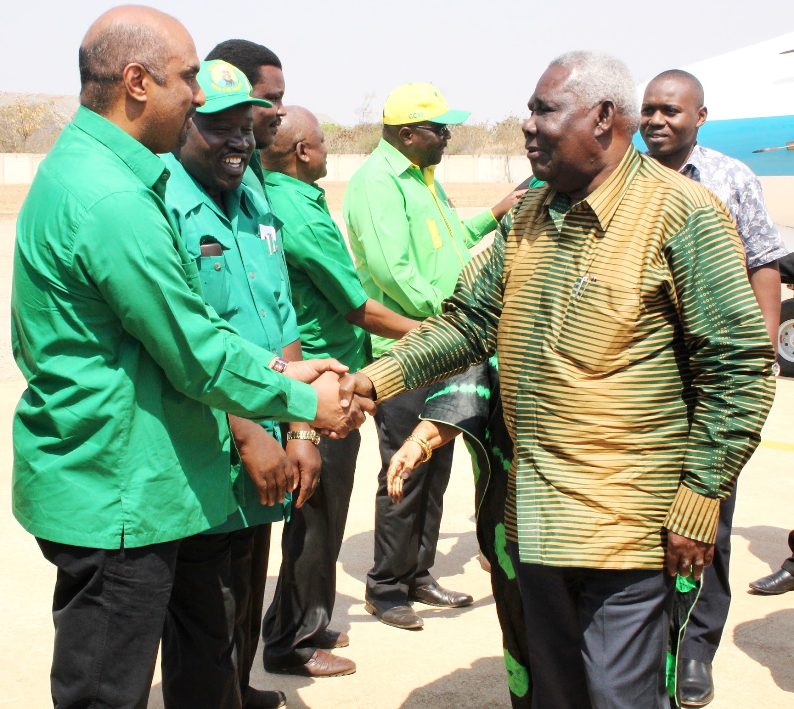Makamu wa Pili wa Rais Zanzibar Balozi Seif Ali Iddi, akisalimiana na mwenyekiti wa CCM Mkoa wa Shinyanga Mabala Mlolwa mara baada ya kushuka kwenye ndege kuanza ziara mkoani Shinyanga.