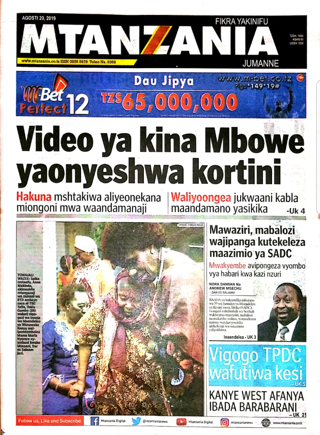 MagazetiPITIA VICHWA VYA HABARI KATIKA MAGAZETI YA LEO JUMANNE AUGUST 20,2019 Last updated: 2019/08/20 at 3:15 AM Alex Sonna 6 years ago Share SHARE Alex Sonna August 20, 2019 August 20, 2019 Share this Article Facebook Twitter Email Print Previous Article BENKI YA MAENDELEO YA AFRIKA-AfDB KULIG’ARISHA JIJI LA DODOMA KWA BARABARA ZA KISASA HUDUMA ZA JAMII Next Article MAKAMU WA PILI WA RAIS ZANZIBAR BALOZI IDD AANZA ZIARA MKOANI SHINYANGA , AKEMEA MAKUNDI NDANI YA CCM KUELEKEA KWENYE UCHAGUZI