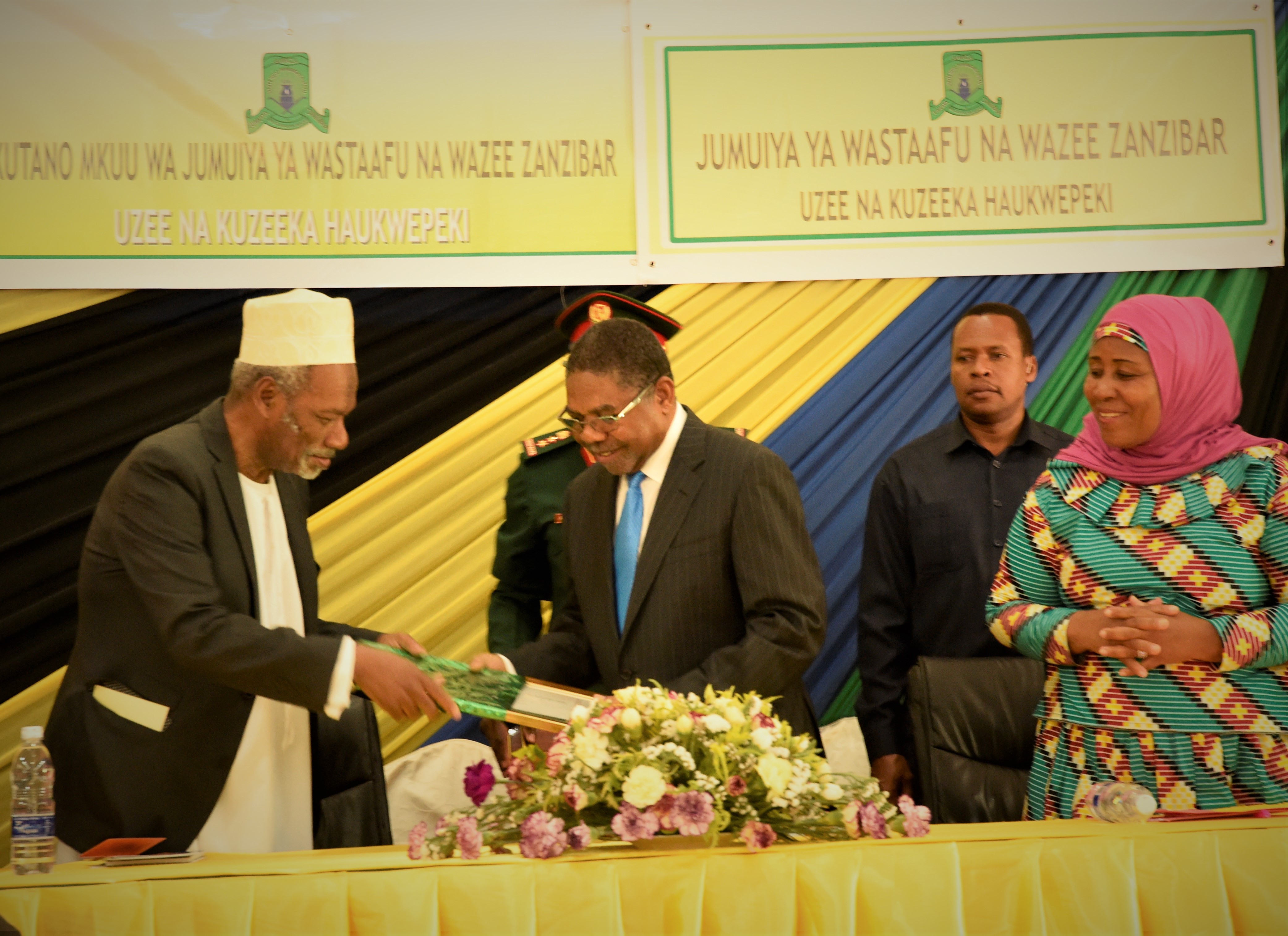 RAIS wa Zanzibar na Mwenyekiti wa Baraza la Mapinduzi Mhe. Dk. Ali Mohamed Shein, akikapidhiwa Cheti cha Shukrani na Mwenyekiti wa Jumuiya ya Wastaaf na Wazee Zanzibar (JUWAZA) Ndg. Masururu Saadun Ferouz, wakati wa hafla ya Uzinduzi wa Jumuiya hiyo uliofanyika katika ukumbi wa Sheikh Idrissa Abdulwakil Kikwajuni Zanzibar , kulia Waziri wa Kazi Uwezeshaji Wazee Wanawake na Watoto Zanzibar Mhe.Maudline Castico.(Picha na Ikulu)