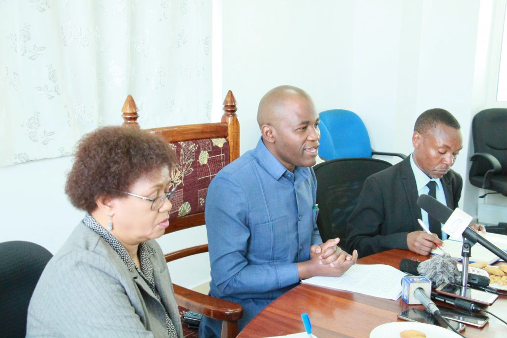 Naibu Waziri wa Afya, Maendeleo ya Jamii, Jinsia, Wazee na Watoto Dkt Faustine Ndugulile (katikati) akizungumza na vyombo vya habari leo Jijini Dodoma kuhusu Kampeni ya Kitaifa ya Kupinga Ukatili wa Kijinsia, kushoto ni Mkurugenzi Msaidizi Idara ya Jinsia Bi. Mboni Mgaza na kulia ni Kaimu Mkurugenzi Idara ya Jinsia Bw. John Mapunda.