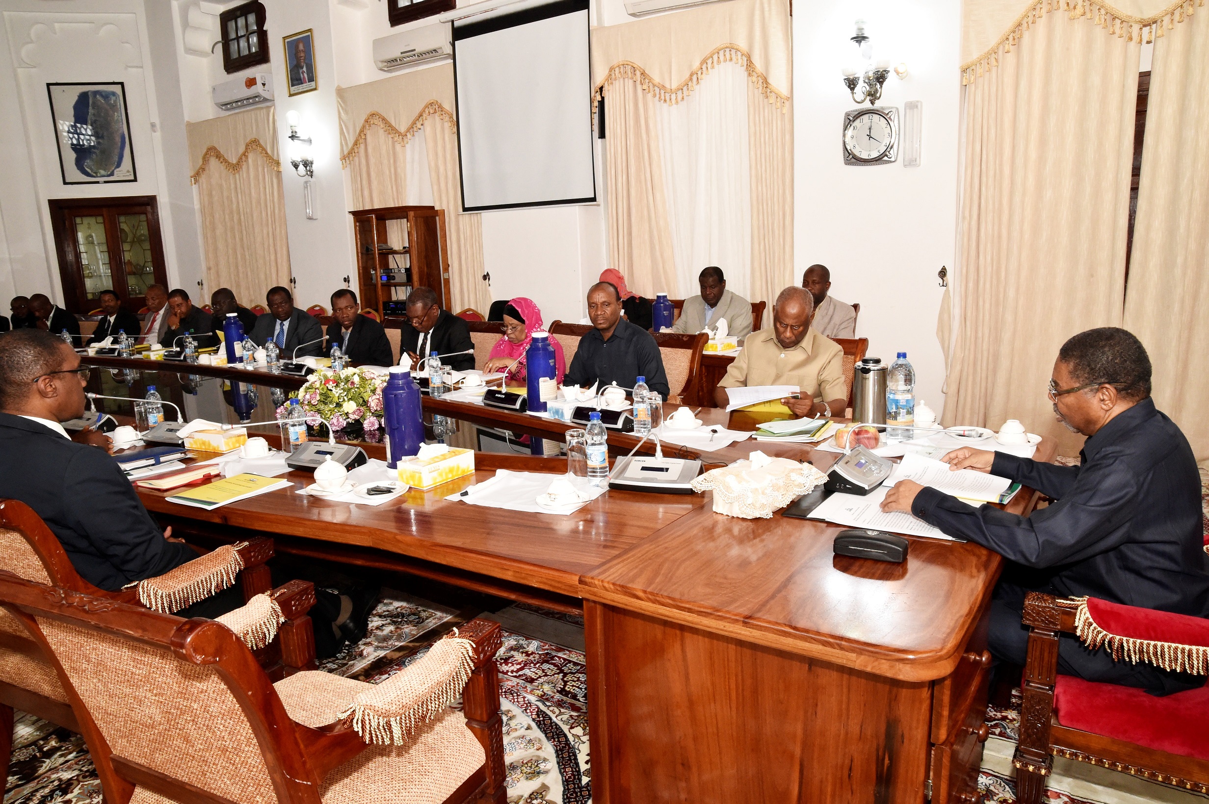 RAIS wa Zanzibar na Mwenyekiti wa Baraza la Mapinduzi Mhe. Dk. Ali Mohamed Shein, akizungumza na Uongozi wa Wizara ya Katiba na Sheria Zanzibar, katika mkutano wa Utekelezaji wa Bajeti na Mpango Kazi kwa mwezi Julai 2018 hadi Juni 2019,uliofanyika ukumbi wa Ikulu Zanzibar leo 22-8-2019.kulia kwa Rais Katibu Mkuu Kiongozi na Katibu wa Baraza la Mapinduzi Dk. Abdulhamid Yahya Mzee na Waziri wa Katiba na Sheria Zanzibar Mhe.Khamis Juma Mwalim.(Picha na Ikulu)