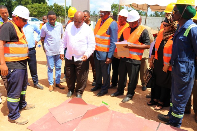 Waziri wa Ujenzi Uchukuzi na Mawasiliano Mhandisi Isack Kamwelwe katikati akikagua baadhi ya malighafi ambazo zimekwishawasili zitakazotumika katika ujenzi wa kivuko kipya kitakachotoa huduma kati ya Mafia na Nyamisati. Ujenzi huo utagharimu kiasi cha shilingi Bilioni 5.3 za kitanzania na unatarajiwa kukamilika ifikaapo mwezi Februari mwaka 2020.