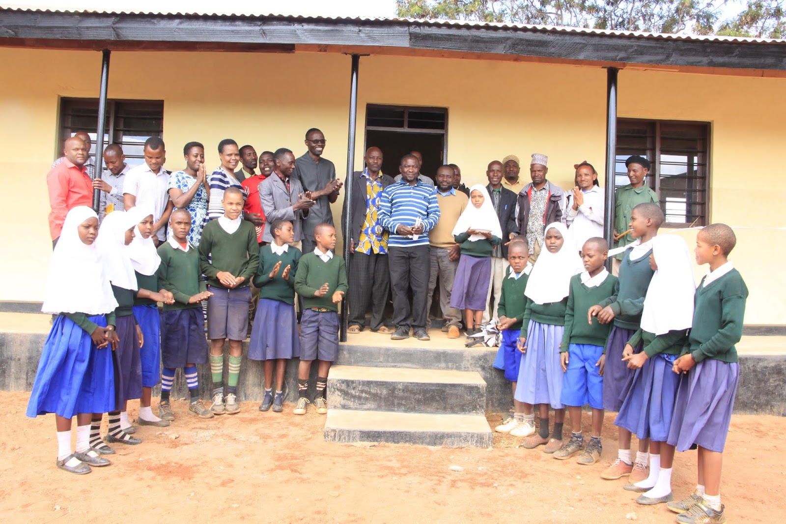 Mwakilishi huyo Mwalimu Kachebele akiwa katika picha ya pamoja na kamati ya Shule ya Msingi Ikhanoda pamoja na baadhi ya wanafunzi wakati wa kupokea madarasa hayo.