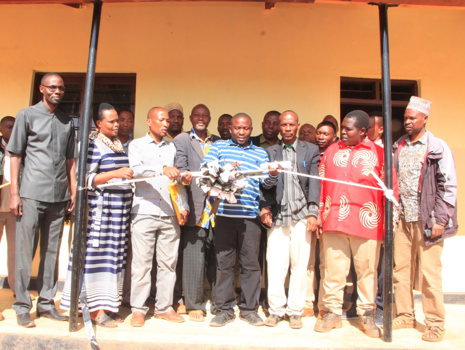 Mwakilishi wa Mkurugenzi Mtendaji wa Halmashauri ya Wilaya ya Singida Vijijini DC, Mwalimu Omari Kachebele (katikati) katika hafla ya kukabidhiwa madarasa mawili na ofisi ya walimu yaliyokarabatiwa na Shirika lisilokuwa la kiserikali la Community Initiatives Promotion (CIP) akikata utepe kuashiria upokeaji wa madarasa hayo katika hafla iliyofanyika mwishoni mwa wiki Shule ya Msingi Ikhanoda iliyopo Ilongero mkoani Singida. Kushoto ni Mkurugenzi Mtendaji wa shirika hilo, Afesso Ogonga.