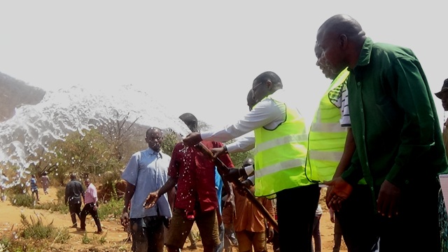 Waziri wa Nishati Dk. Medard Kalemani akiangalia maji yanyovutwa kwa umeme kutoka katika moja ya shimo la mgodi wa Mkwamba mara baada ya kuwasha umeme katika mgodi huo