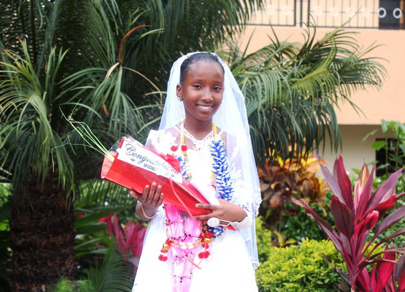 | Mtoto Angel Raymond Mushi (kushoto) pamoja na mpambe wake akikata keki katika hafla ya pongezi iliyoandaliwa na wazazi wake nyumbani kwao. |