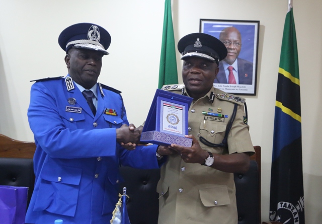 Mkuu wa Jeshi la Polisi Nchini IGP Simon Sirro, akipokea zawadi kutoka kwa Mkuu wa Jeshi la Polisi Nchini Sudani, Adil Mohamed Ahmed, ambaye yupo nchini Tanzania kwa ziara ya kikazi ya siku mbili, ziara ambayo imelenga kuzidi kuimarisha ushirikiano uliopo kati ya Jeshi la Polisi Tanzania na Jeshi la Polisi la Sudani.