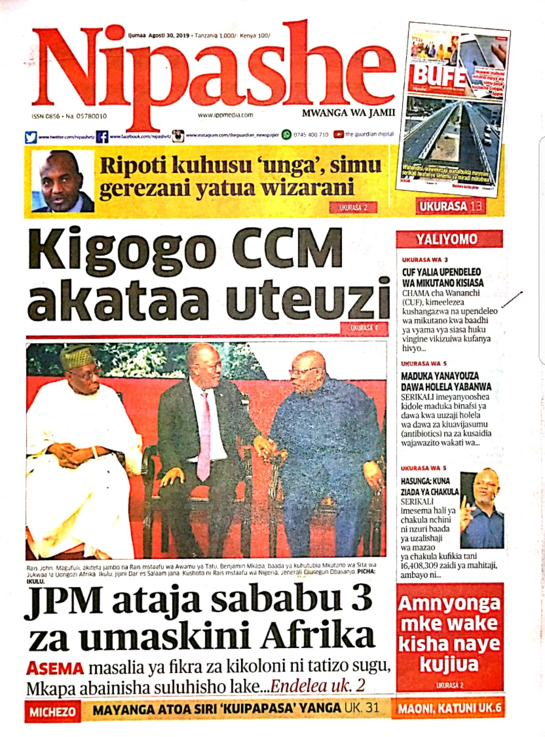 MagazetiPITIA VICHWA VYA HABARI KATIKA MAGAZETI YA LEO IJUMAA AUGUST 30,2019 Last updated: 2019/08/30 at 3:44 AM Alex Sonna 6 years ago Share SHARE Alex Sonna August 30, 2019 August 30, 2019 Share this Article Facebook Twitter Email Print Previous Article WAFANYABIASHARA WALALAMIKIA KUTOKAMILIKA KWA CHOO CHA SOKO Next Article DC MBONEKO AWAAGIZA MAOFISA KILIMO KUACHIA VITI MAOFISINI