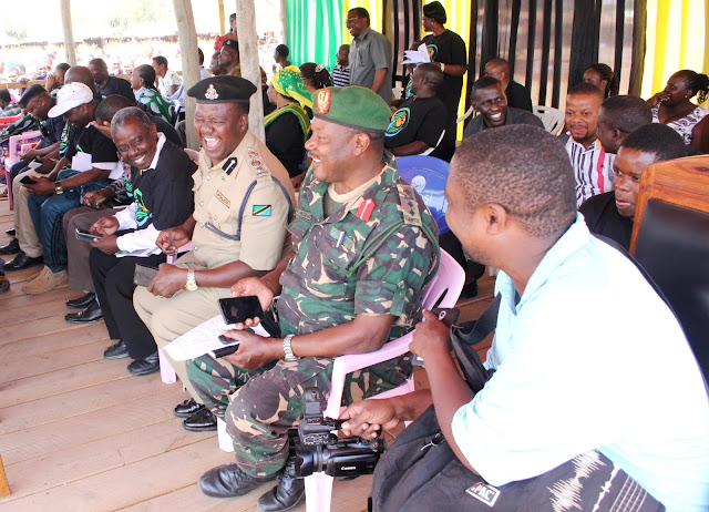 Viongozi mbalimbali wa kiserikali pamoja na vyombo vya dola, wakifurahia jambo kwenye uzinduzi huo wa Kampeni ya Nyumba ni choo mkoani Shinyanga, ya kuhamasisha wananchi wajenge vyoo bora pamoja na kuvitumia.