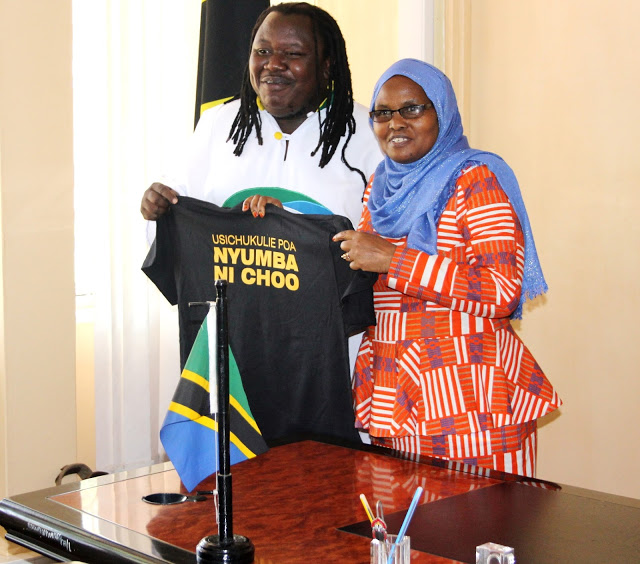 Mkuu wa mkoa wa Shinyanga Mhe. Zainab Telack awali kabla ya kwenda kwenye viwanja vya Zimamoto kuzindua kampeni ya nyumba ni choo akipiga picha ya pamoja na Balozi wa uhamasishaji wa kampeni hiyo Mrisho Mpoto kwenye ofisi ya mkuu wa mkoa.