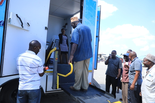 Katibu wa Chama cha Mapinduzi Kata ya Buza, Shabani Abdallah akipanda katika ngazi maalumu kwa ajili ya watu wenye ulemavu wakati gari la Mahakama Inayotembea likitoa elimu kuhusu Mahakama hiyo leo kwenye eneo la Buza Stendi, lililopo Wilaya ya Temeke jijini Dar es Salaam.