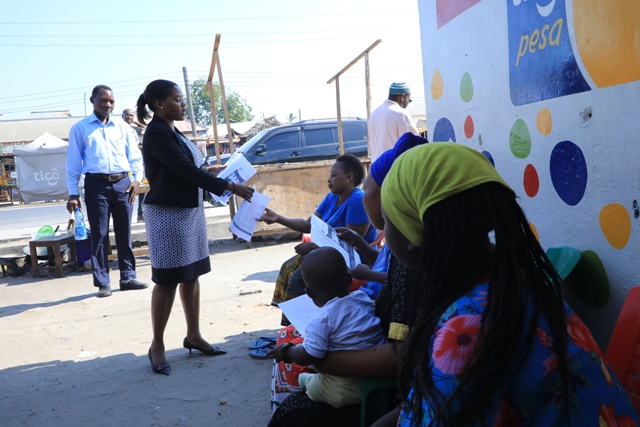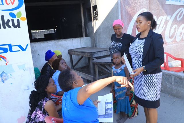 Hakimu wa Mahakama ya Mwanzo Bunza, Mhe. Florence Madelemo akiwagawia wakazi wa eneo la Buza Lulenge vipeperushi kuhusu Mahakama Inayotembea.