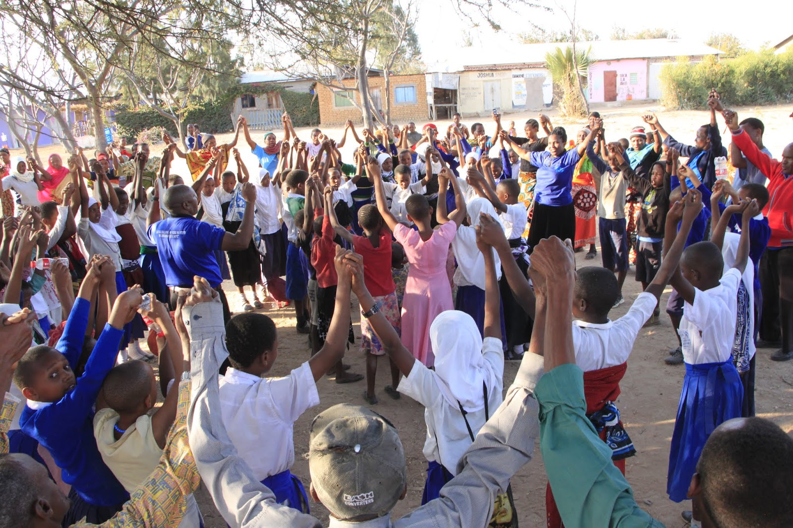Wananchi wa Kata ya Iseke, wanafunzi kutoka Shule za Ihanja, Unyangwe na Nkhoiree pamoja na maofisa wanaosimamia mradi wa kupambana na mila potofu za ukeketaji na ukatili wa Kijinsia wakionesha mshikamano wa kutokomeza kabisa vitendo hivyo katika mkutano wa hadhara uliofanyika Kata ya Iseke wilayani Ikungi mkoani Singida juzi.