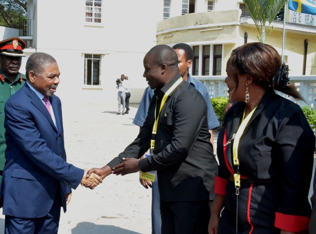 RAIS wa Zanzibar na Mwenyekiti wa Baraza la Mapinduzi Dk.Ali Mohamed Shein akisalimiana na Rais wa UTPC Deogratias Nsokolo alipowasili katika viwanja vya ukumbi Idris Abdul Wakili Vuga Mjini Zanzibar katika ufunguzi wa Mkutano Mkuu wa Wanachama wa Muungano wa Klabu za Waandishi wa Habari Tanzania-UTPC uliofanyika leo.[Picha na Ikulu]