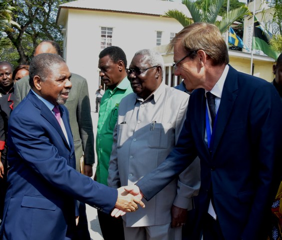 RAIS wa Zanzibar na Mwenyekiti wa Baraza la Mapinduzi Dk.Ali Mohamed Shein akisalimiana na Balozi wa Sweden Nchini Tanzania Anders Sjøberg alipowasili katika viwanja vya ukumbi Idris Abdul Wakili Vuga Mjini Zanzibar leo katika ufunguzi wa Mkutano Mkuu wa Wanachama wa Muungano wa Klabu za Waandishi wa Habari Tanzania-UTPC .[Picha na Ikulu] 07/09/2019.