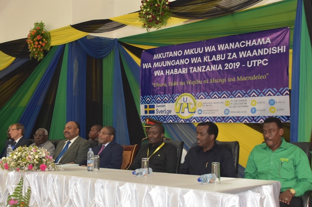 RAIS wa Zanzibar na Mwenyekiti wa Baraza la Mapinduzi Dk.Ali Mohamed Shein (katikati) pamoja na Viongozi wengine katika Mkutano Mkuu wa Wanachama wa Muungano wa Klabu za Waandishi wa Habari Tanzania-UTPC uliofanyika leo katika ukumbi Idris Abdul Wakili, Vuga Mjini Zanzibar,(wa tatu kulia) Rais wa UTPC Deogratias Nsokolo .[Picha na Ikulu] 07/09/2019.