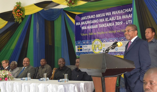 RAIS wa Zanzibar na Mwenyekiti wa Baraza la Mapinduzi Dk.Ali Mohamed Shein (kulia) akitoa hutuba yake katika ufunguzi wa Mkutano Mkuu wa Wanachama wa Muungano wa Klabu za Waandishi wa Habari Tanzania-UTPC uliofanyika leo katika ukumbi wa Idris AbdulWakil,Vuga Mjini Zanzibar. [Picha na Ikulu] 07/09/2019.