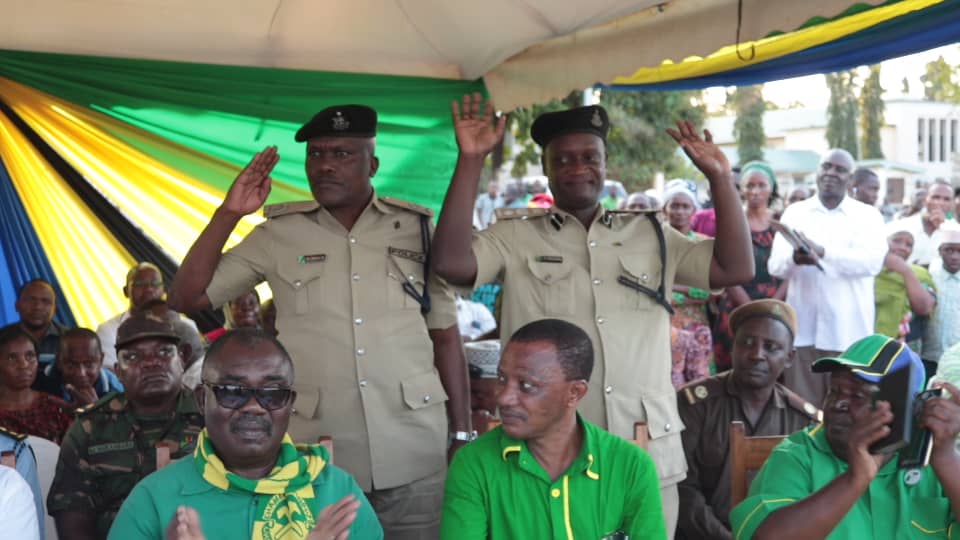RTO wa Mkoa wa Tanga Solomon Mwangamilo kushoto akiwa na na Kaimu Kamanda wa Polisi Mkoa wa Tanga Leons Rwegasira wakijitambulisha kwenye mkutano wa hadhara wa mkuu wa mkoa wa Tanga Martine Shigella