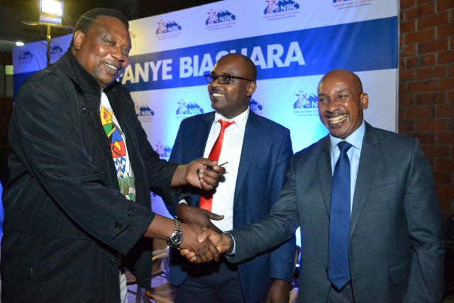 Katibu Tawala Mkoa wa Arusha, Richard Kwitega (kushoto), akishikana mikono na Mkurugenzi wa Wateja Wakubwa Benki ya NBC, Linley Kapya huku Meneja wa Tawi la NBC Arusha, Mirage Msuya akiangalia katika hafla iliyoandaliwa na benki hiyo kwa wateja wake jijini Arusha hivi karibuni.
