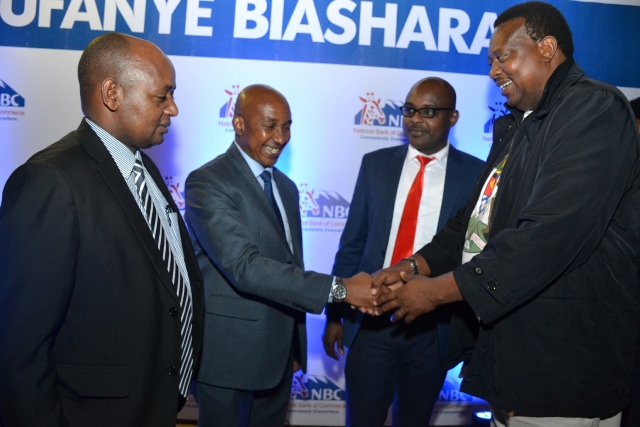 Mkurugenzi wa Wateja Wakubwa Benki ya NBC, Linley Kapya (wa pili kushoto) akishikana mikono na Katibu Tawala Mkoa wa Arusha, Richard Kwitega katika hafla iliyoandaliwa na benki hiyo kwa wateja wake jijini Arusgha hivi karibuni. . Waaoangalia kutoka kushoto ni Mkuu wa Wilaya ya Arusha, Gabriel Daqarro na Meneja wa Tawi la NBC Arusha, Mirage Msuya.
