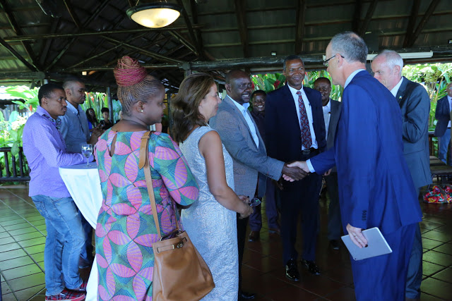 Naibu Waziri wa Elimu, Sayansi na Teknolojia, Mh.William Ole Nasha akisalimiana na Mkurugenzi Mtendaji wa SAP Ireland, Bw. Liam Ryan (aliyeipa kamera mgongo) akiwa na Balozi wa Ireland nchini, Mh. Paul Sherlock (kulia kwa Ryan) pamoja na Mkuu wa kitengo cha Mawasiliano na Habari UNESCO nchini, Nancy Kaizilege (kushoto) mara baada ya kuwasili katika hafla mchapalo ya uzinduzi wa Programu ya Africa Code week Tanzania iliyofanyika Hoteli ya Sea Cliff mwishoni mwa wiki jijini Dar es Salaam.