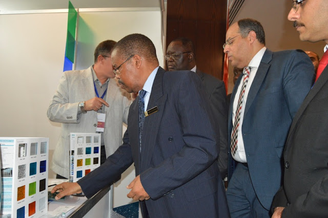 Waziri wa Mambo ya nje, Ramadhan Mwinyi, akiangalia vioo vilivyotengenezwa kwa Polycarbonate sheets na wafanyabiashara kutoka Misri yanayoendelea kufanyika hoteli ya Hyatt (Kilimanjaro) kuanzia leo Septemba 11 hadi 14 jijini Dar es Salaam.