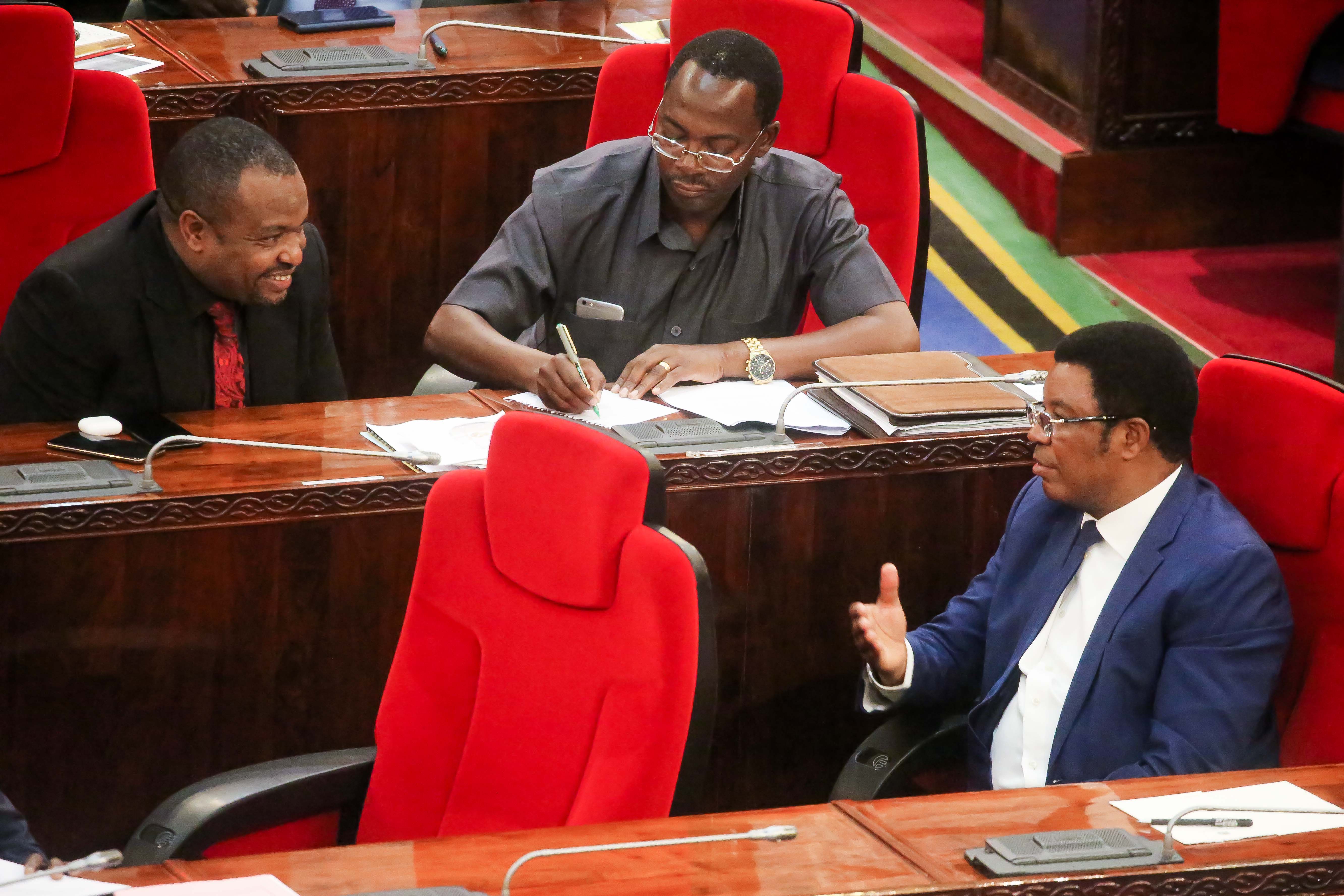 Waziri Mkuu Kassim Majaliwa, akizungumza na Naibu Waziri wa Madini, Stanslaus Nyongo (kushoto) Bungeni jijini Dodoma, Septemba 12.2019. Katikati ni Waziri wa Nchi Ofisi ya Makamu wa Rais Muungano na Mazingira, George Simbachawene. (Picha na Ofisi ya Waziri Mkuu).