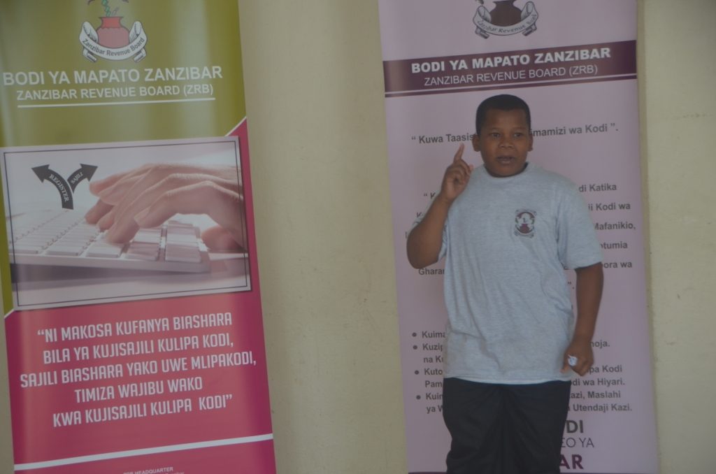 Mwanafunzi Kutoka Skuli ya Sekondary ya Biashara Mombasa Haidar Suleiman Rashid akiwasilisha mada katika Mdahalo kuhusu Kodi kwa Skuli za Sekondary Kanda ya Unguja uliofanyika katika Ukumbi wa Chuo Kikuu cha Zanzibar SUZA Kampasi ya Vuga Zanzibar.Ikiwa ni Shamra shamra za kutimia miaka 20 ya Bodi ya Mapato Zanzibar.