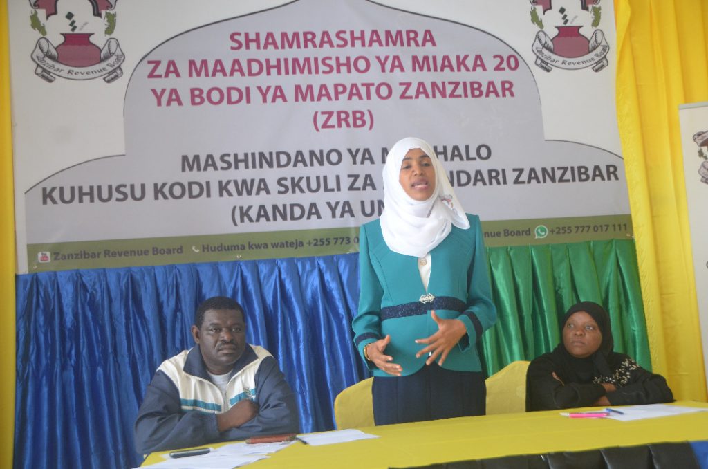 Afisa Elimu ZRB Raya Suleiman Abdalla akitoa hotuba ya Ufunguzi wa Mdahalo kuhusu Kodi kwa Skuli za Sekondary Kanda ya Unguja uliofanyika katika Ukumbi wa Chuo Kikuu cha Zanzibar SUZA Kampasi ya Vuga Zanzibar. Ikiwa ni Shamra shamra za kutimia miaka 20 ya Bodi ya Mapato Zanzibar.