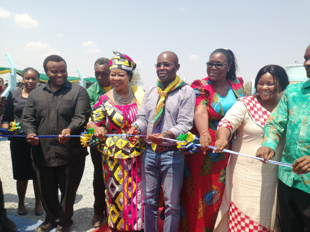 Waziri wa Maji, Mhe. Prof. Makame Mbarawa (Mb) akikata utepe kuzindua rasmi mradi wa maji wa Kijiji cha Shilima, Kata ya Kikubiji, Wilaya ya Kwimba, Mkoani Mwanza.
