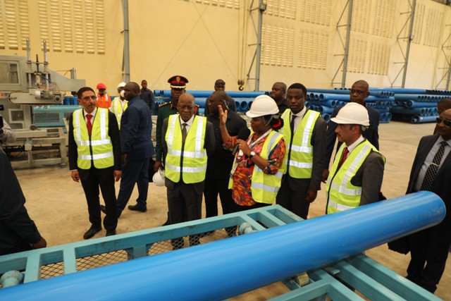 Rais wa Jamhuri ya Muungano wa Tanzania Dkt. John Pombe Magufuli akisikiliza maelezo ya kazi za uzalishaji za Pipe Industries Co. Limited akiwa na Waziri wa Viwanda na Biashara Mhe. Innocent Bashungwa pamoja na Wakurugenzi Wakuu wa kiwanda hicho Bw,. Seif A. Seif na Nassor A. Seif pamoja na viongozi na wadau wengine pazia kuashiria kufunguliwa rasmi kwa kiwanda chao cha kutengeneza mipira na abomba ya plastiki eneo la Vingunguti jijini Dar es salaam leo