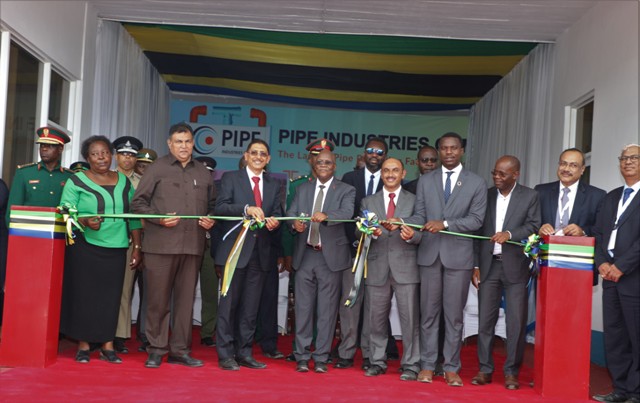 Rais wa Jamhuri ya Muungano wa Tanzania Dkt. John Pombe Magufuli akikata utepe akiwa na Waziri wa Viwanda na Biashara Mhe. Innocent Bashungwa pamoja na Wakurugenzi Wakuu wa Pipe Industries Co. Limited Bw,. Seif A. Seif na Nassor A. Seif pamoja na viongozi na wadau wengine pazia kuashiria kufunguliwa rasmi kwa kiwanda chao cha kutengeneza mipira na mabomba ya plastiki eneo la Vingunguti jijini Dar es salaam leo Septemba 16. 2019