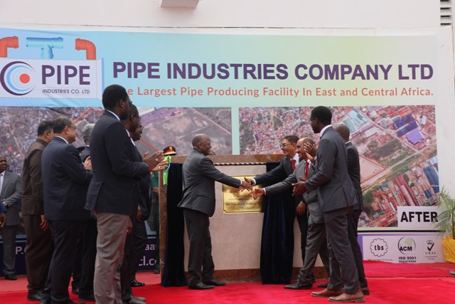 Rais wa Jamhuri ya Muungano wa Tanzania Dkt. John Pombe Magufuli akipeana mikono na Wakurugenzi Wakuu wa Pipe Industries Co. Limited Bw,. Seif a, Seif na Nassor A. Seif baada ya kufunua pazia kuashiria kufunguliwa rasmi kwa kiwanda chao cha kutengeneza mipira na mabomba ya plastiki eneo la Vingunguti jijini Dar es salaam leo Septemba 16.