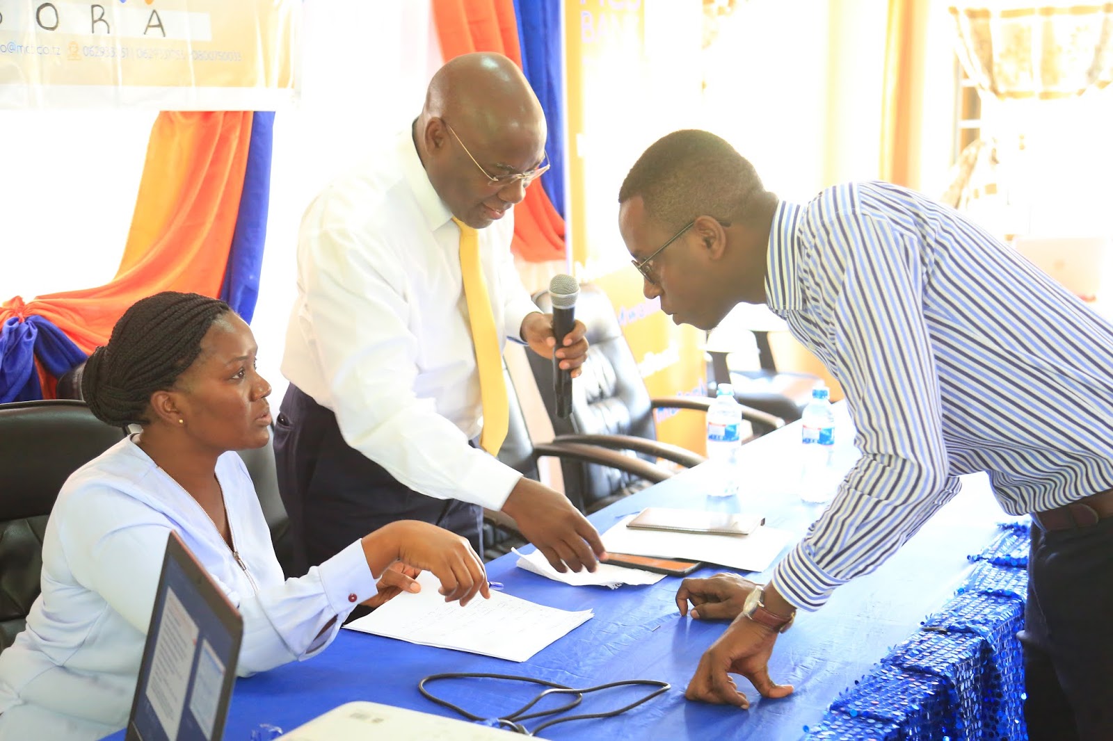 Afisa Mtendaji Mkuu wa Mwalimu Commercial Bank Plc. Bw. Richard Makungwa (katikati), akijadiliana jambo na Kaimu Mkuu wa Biashara na Masoko wa enki hiyo na Afisa Uhusiano, Bw. Said Rajabu wakati wa kongamano hilo.