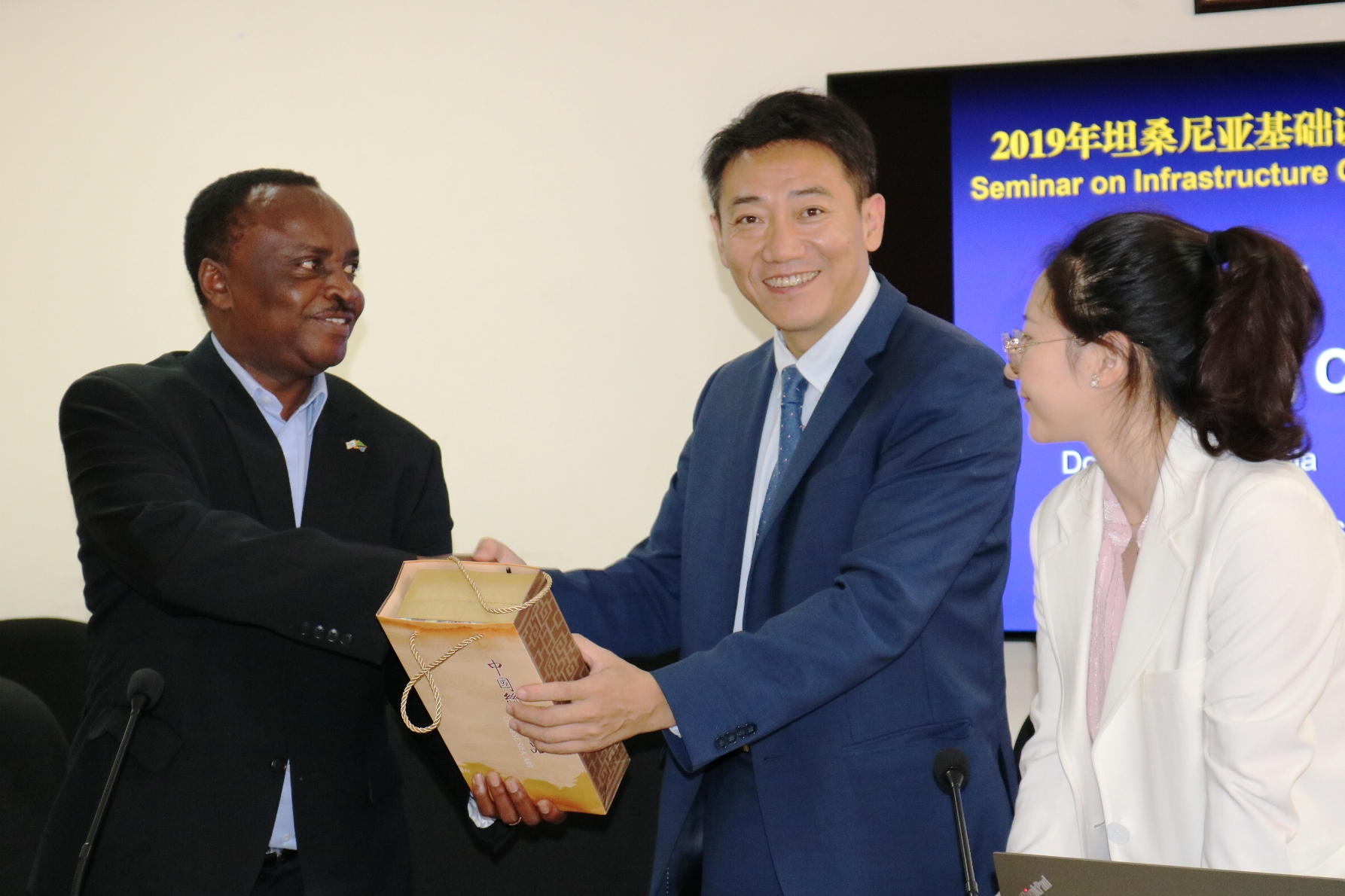 Mkurugenzi Msaidizi wa Barabara kutoka Wizara ya Ujenzi, Uchukuzi na Mawasiliano (Sekta ya Ujenzi), Mhandisi John Ngowi, akipokea zawadi kutoka kwa Prof. Mingjian Zhu (katikati), mara baada ya kufungua semina ya wiki mbili kuhusu masuala ya ujenzi wa miundombinu inayotolewa na wataalamu kutoka nchini China, jijini Dodoma.
