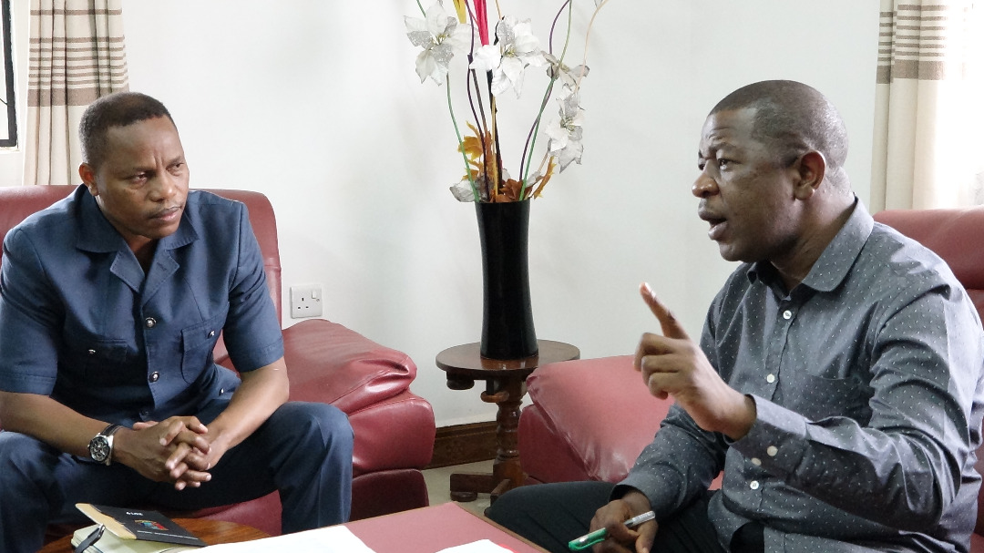 Naibu Waziri wa Mifugo na Uvuvi Mhe. Abdallah Ulega (kulia) akibadilishana mawazo na Mkuu wa Mkoa wa Kagera Brigedia Jenerali Marco Gaguti mara baada ya kuwasili ofisini kwake kuanza ziara ya kanda ya ziwa.